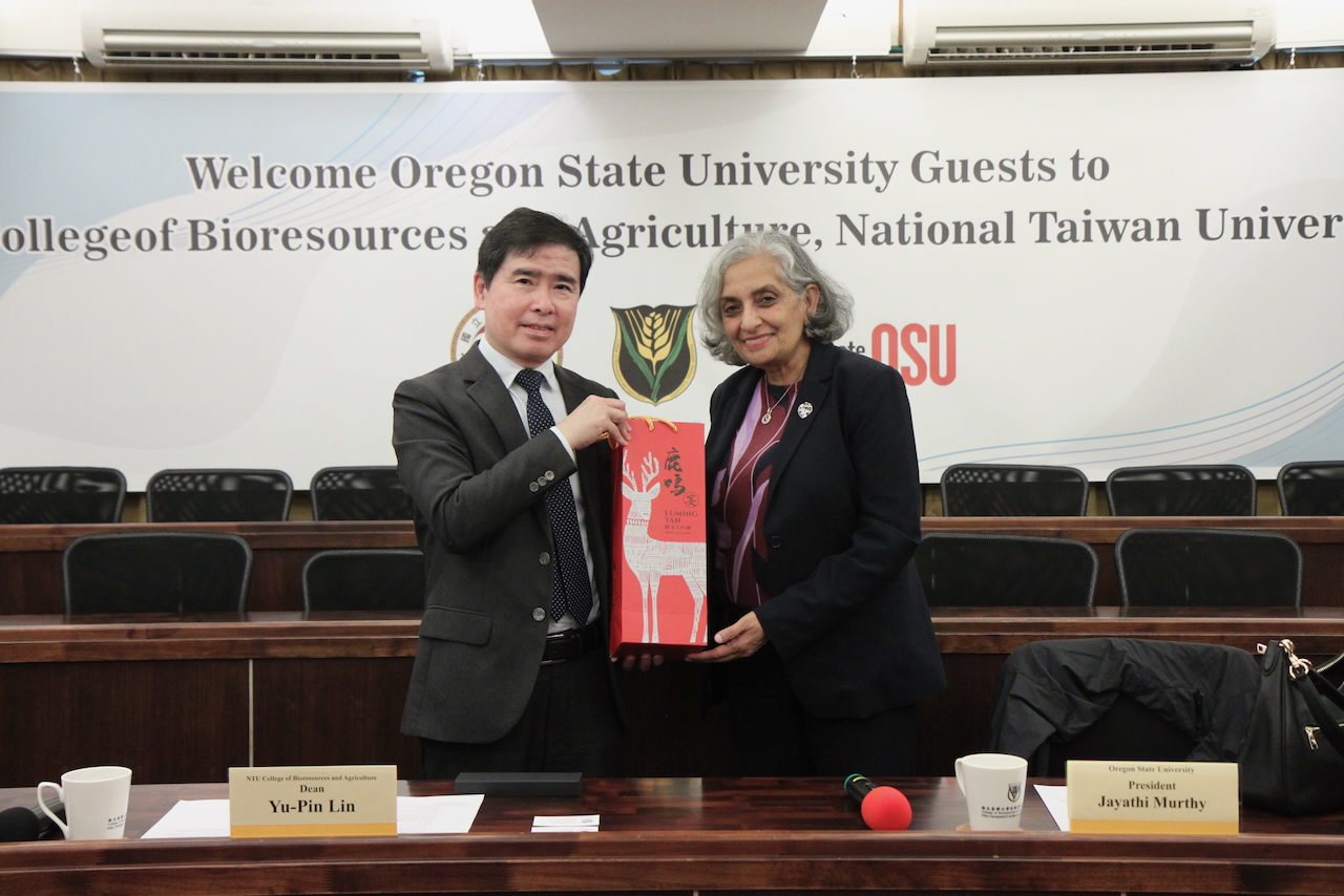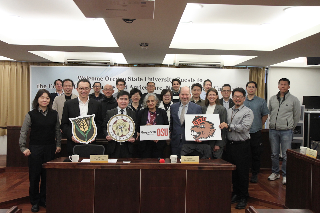 美國Oregon State University(OSU)代表團於2026年3月6日蒞臨本院訪問交流,進一步深化兩校在農學與生物資源領域的學術合作。此次代表團由OSU校長Jayathi Murthy率團,成員包括副校長Rob Odom及校長辦公室幕僚長Jennifer Humphreys。 訪問期間,OSU代表團與生農學院師長進行學術交流座談,本院林裕彬院長介紹本院與OSU已經建立起的友好關係及學術交流,並期待能更進一步深化與該校農學院和森林學院的合作。林院長也提到本院已與OSU就智慧農業、跨領域研究合作及學生交流等議題深入討論,展現雙邊未來合作的多元潛力。此外我們也已與該校的農學院及森林學院締結交換學生協議,近期將能致力推動學生交流。目前我們正期許促成與該校農學院和森林學院的博士雙學位計劃。 隨後,OSU代表團參訪本院智慧溫室與綠色健康中心相關設施,了解本院在智慧農業應用與綠色健康研究方面的最新成果與發展方向。當日下午,代表團並由本院陪同前往行政大樓拜會臺大丁詩同副校長以及楊國鑫副國際長。OSU聆聽校務簡報與交流討論,並提到願意在農學、森林學院以及AI等領域推動合作。此次訪問不僅促進雙方在特定研究領域與教師合作方面的深入交流,也進一步鞏固兩校既有的合作基礎,並為本院預計於今年5月回訪OSU奠定良好基礎,持續推動雙方在農學、生物資源與跨領域研究領域的長期合作。 林裕彬院長致贈禮物給奧瑞岡州立大學 Murthy校長 本院出席座談會師長與OSU Murthy校長等一行訪賓於座談會後合影 奧瑞岡州立大學訪賓與校方丁詩同副校長、楊國鑫副國際長、本院林裕彬院長等師長代表合影